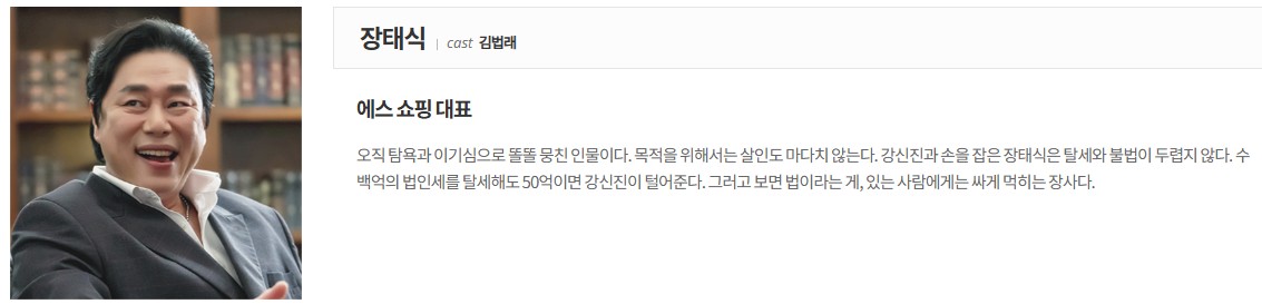 그는 남을 절대 믿지 않는다. 그가 믿는 것은 오직 남의 약점이고 그게 바로 힘이라고 믿는다. 전.현직 대통령의 불법 대선자금과 재벌들의 온갖 비리를 쥐고, 막대한 비자금과 재판 거래로 사법부에 막강한 영향력을 행사한다. 더하여 강신진을 알고 있다. 정재계인사들의 진짜 약점은 욕심이라는 것을, 그들이 욕심을 버리지 못하는 한 대한민국은 강신진의 손아귀를 벗어나지 못한다.